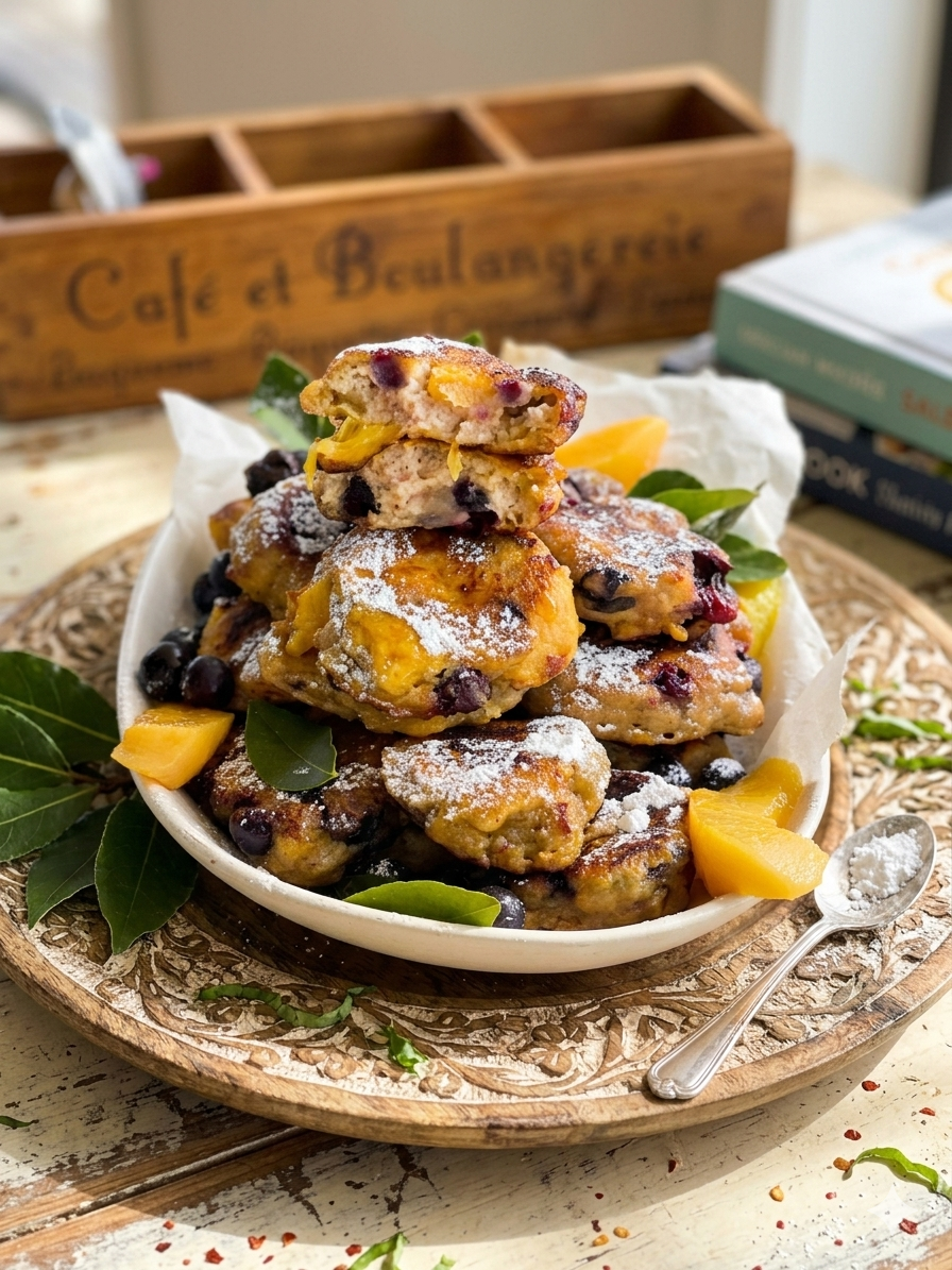 These Peach Fritters are delicious, moist, and sweet fritters ready in under 20 minutes, made with no eggs and no dairy, not deep fried, and full of